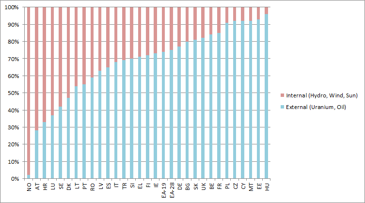 EU contries are shown, ordered by "Conventional Thermal" utilization from left ro right.
